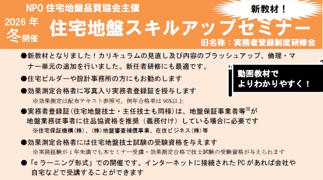 | 特記事項1 | ●実務経験が1年未満の方が住宅地盤技士試験を受けるための指定セミナーです。 ●2023年の受講者は、2026年9月末で期限切れです。 (研第23xxxx の方) 技士・主任技士資格を取得していない方は今回の受講が必要です。 |
